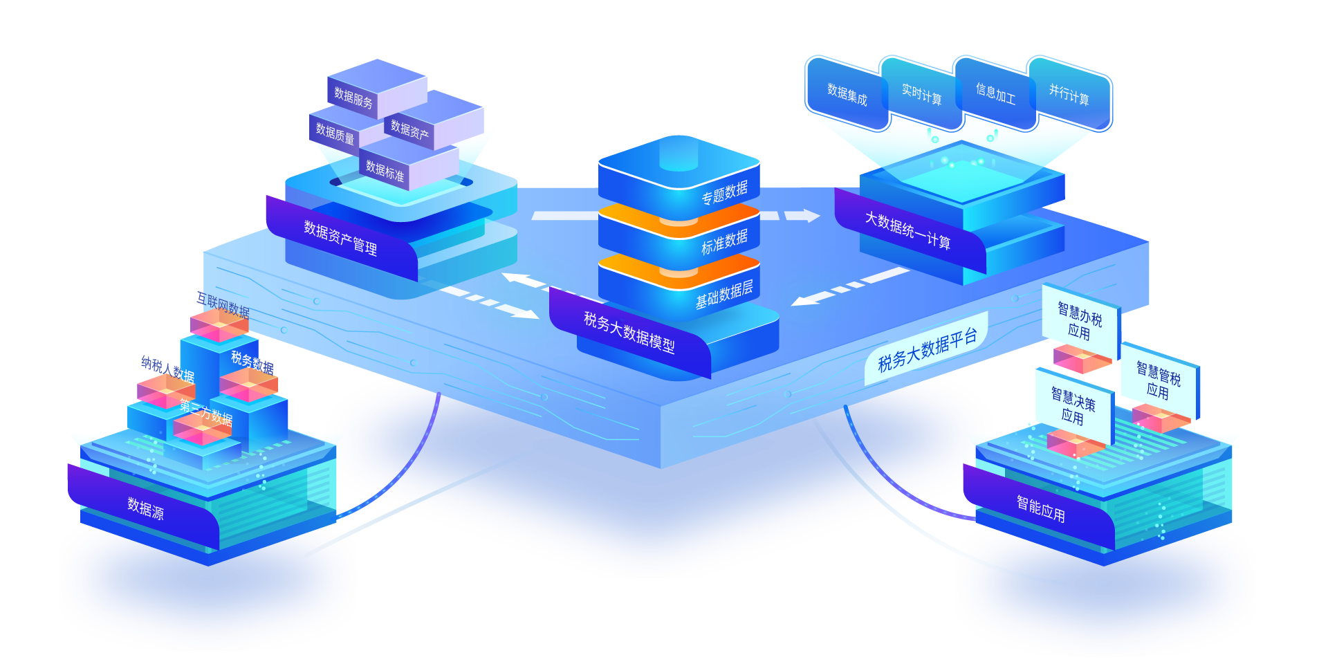 稅務大數據模型中心通過歸集全局原始業務數據,開展標準化的加工計算,形成基礎數據層及高價值標準數據層、主題數據層,為自然人、法人等各類涉稅應用提供統一的數據支撐和服務。 -