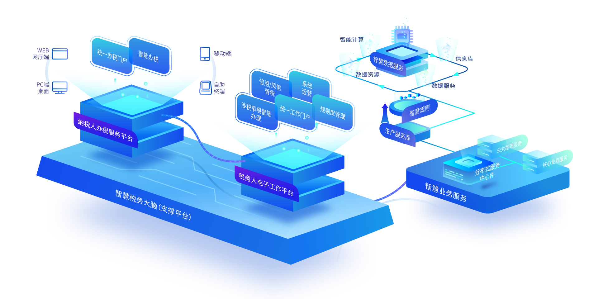 貫穿傳統網站、電腦桌面、智能手機、自助終端的智慧稅務平臺,通過智慧業務服務平臺和智慧數據服務中臺支撐智慧化的納稅人辦稅平臺、稅務人電子工作臺,為納稅人、稅務人員、社會公眾和中介機構服務。